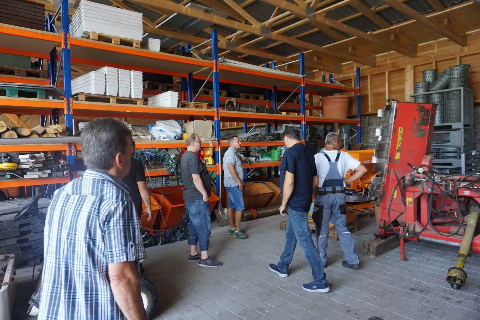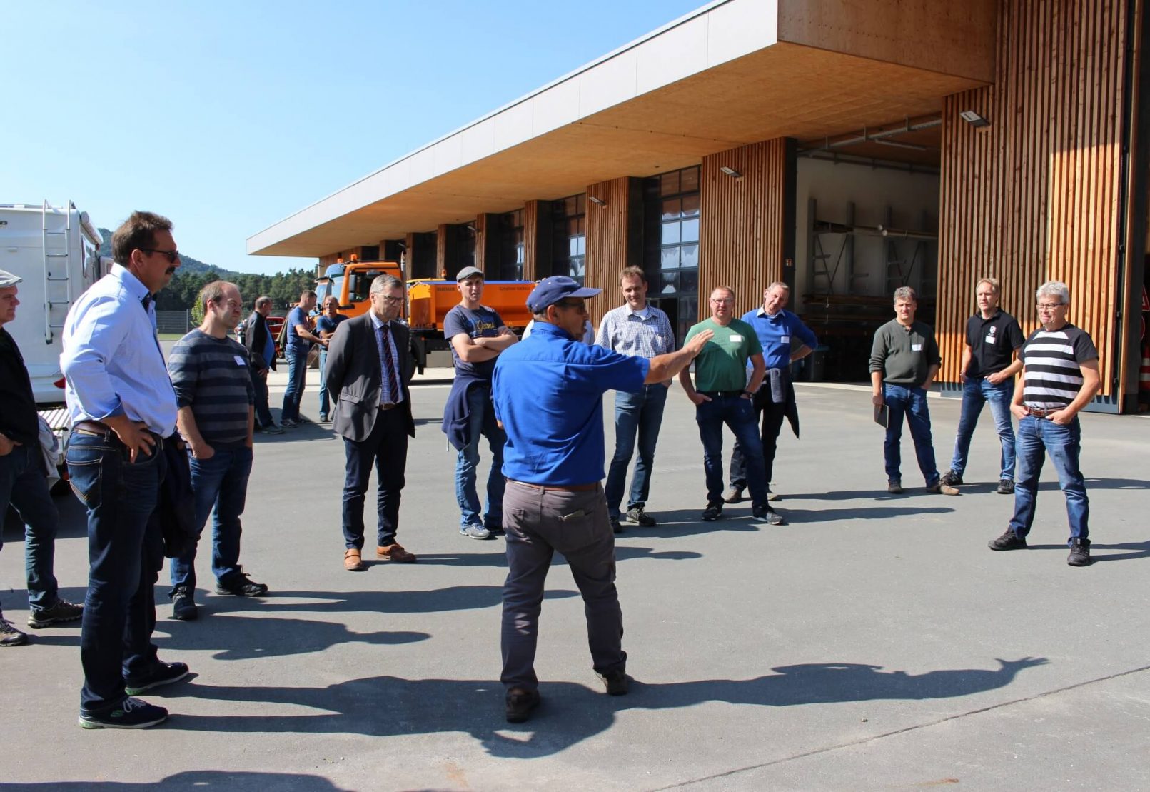 Gestärkt vom gemeinsamen Mittagessen ging es nachmittags auf den Bauhof in Knittlingen, gelegen zwischen Karlsruhe und Pforzheim, auf dessen Gelände sich auch die Freiwillige Feuerwehr, das Deutsche Rote Kreuz, das Wasserwerk und die Elektrowerkstatt mit Straßenbeleuchtung befinden. Am Bauhof sind 19 Mitarbeiter beschäftigt, die nicht nur als Handwerker Vieles in Eigenregie erledigen, sondern u. a. auch den Betrieb des Freibads sicherstellen. Bei der Besichtigung des 2017 neu errichteten Bauhofs fand ein reger Erfahrungsaustausch zwischen den Teilnehmern und den Bauhofmitarbeitern statt.