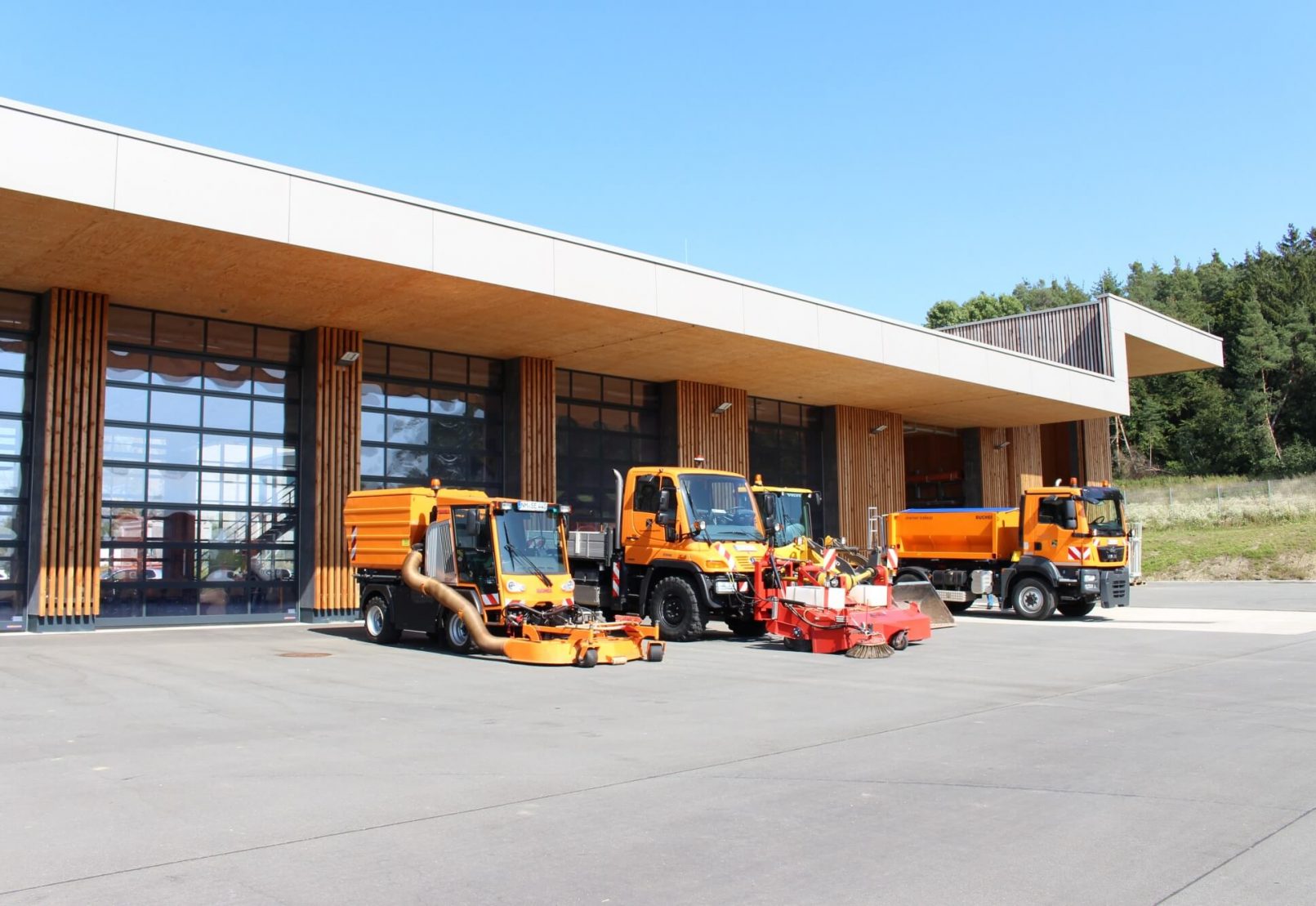 Bereits währenddessen konnten sich alle umsehen und den eindrucksvollen Bauhof bestaunen. Das Gebäude wurde bis auf die Waschhalle komplett in Massivholzbauweise errichtet. Durch die Verwendung von Holz, Holzdämmstoffen und Glasschaumschotter konnte weitestgehend auf Kunststoff verzichtet werden. Dafür gab es sogar einen Preis beim Bundeswettbewerb „HolzbauPlus“ in der Kategorie „Gewerbliches Bauen – Neubau“. Außerdem sind unter einem Dach alle Arbeitsbereiche und Gebäudeteile vereint: Verwaltung und Personalräume, Werkstätten, Magazin und Lager, Fahrzeughalle, überdachter Außenlagerplatz, Wasch- und Salzhalle.
